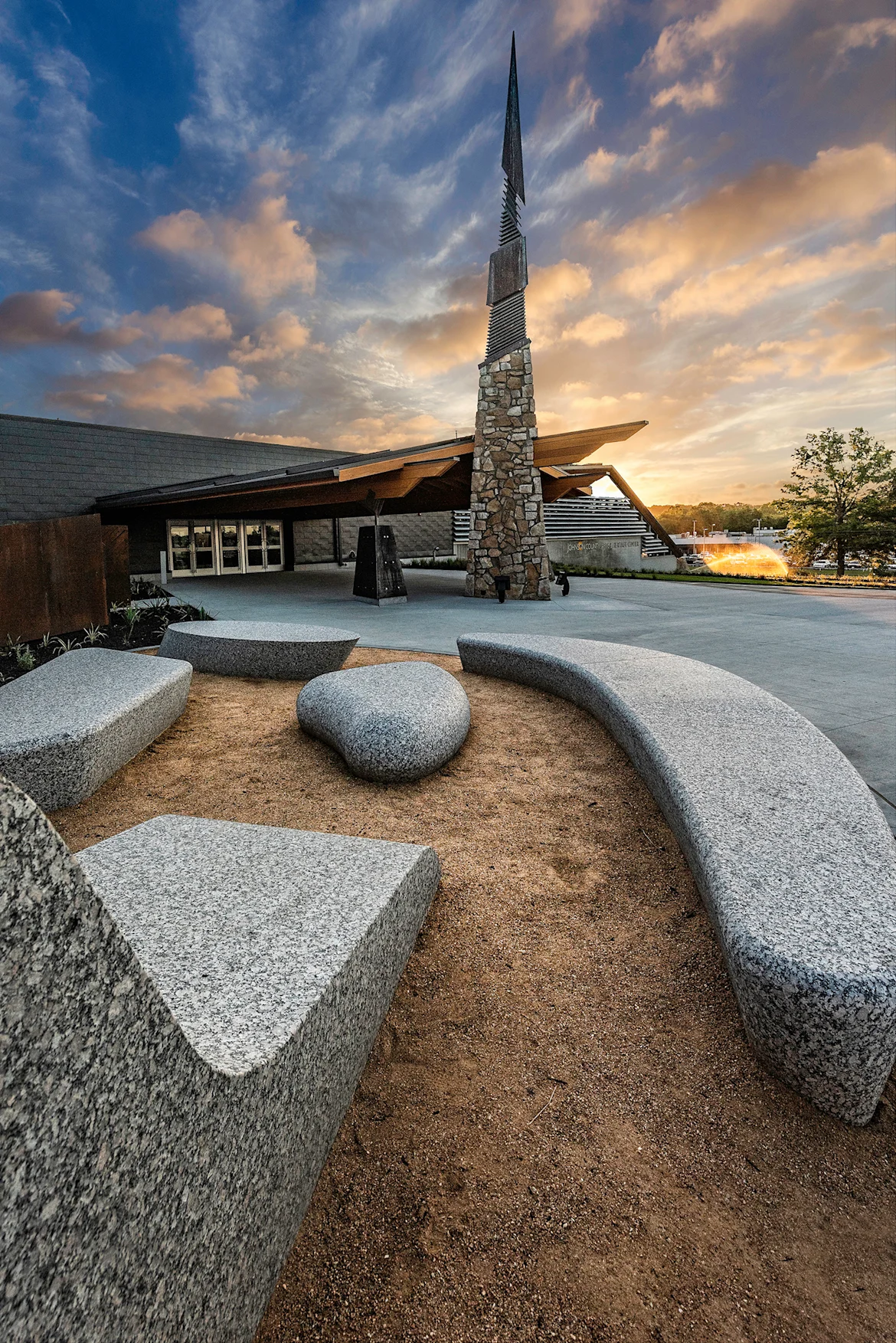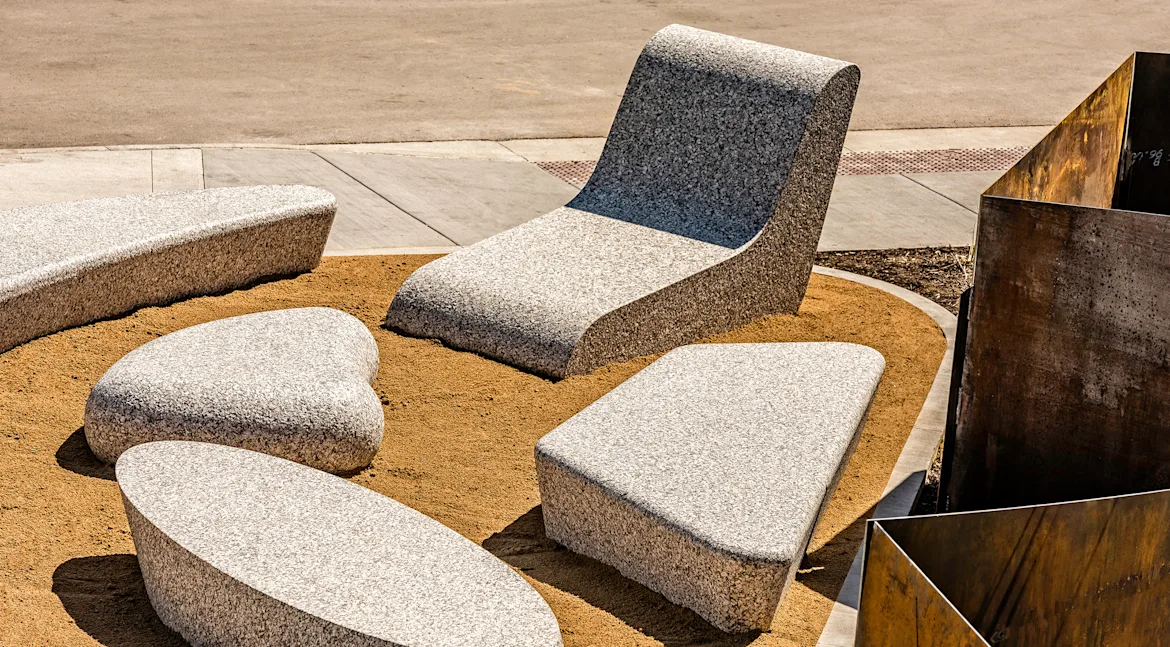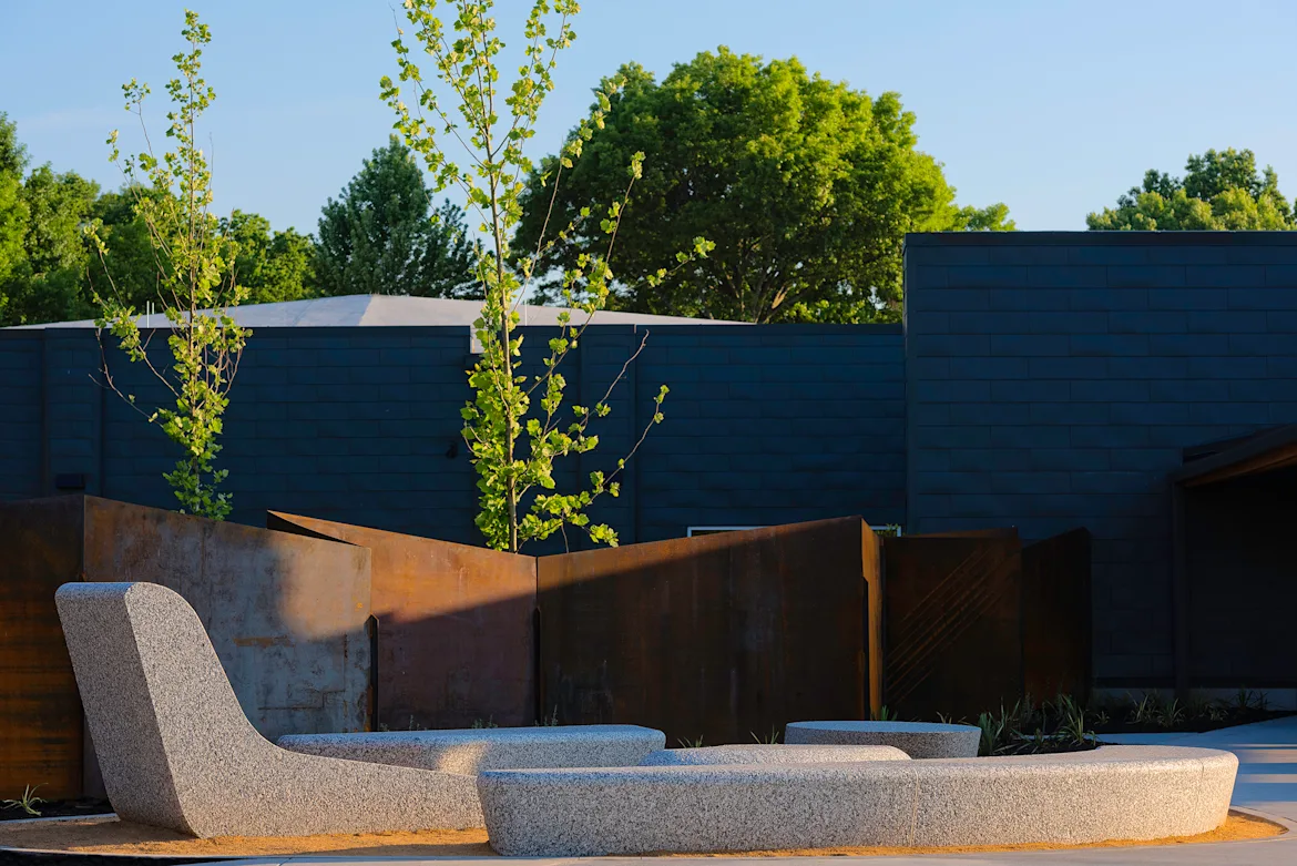 Within an architectural context that celebrates post-WWII optimism, industry and the historic migration to the suburbs and, at the same time, a modern sensibility of new urbanism, adaptive redevelopment and people friendly places, five archetypal forms are explored that are consistent with mid-century modern design and create a functional art element, an outdoor room for public gathering entitled Assemblage. “Assemblage” within the art world is a form of sculpture comprised of three-dimensional objects arranged so that they create a piece. The word “Assemblage” is also defined as a gathering of people.